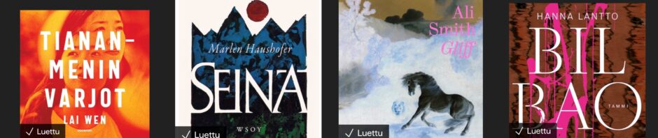 Marlen Haushofer: Seinä. Jo 1963 julkaistu, klassikoksi mainittu teos, joka kyllä suomennettu nopeasti ilmestymisensä jälkeen, mutta noussut hypeen vasta hiljattain. Alkuun hirmuiset kirjastojonot, nyt kai helpottaneet. Mutta kyllä on lukuaikapalveluissa puolensa. Tarinassa keski-ikäinen nainen on  Alpeilla serkkunsa ja tämän puolison metsästysmajassa. Eräänä päivänä nämä eivät ilmaannu takaisin käynniltään läheisessä kylässä, sen sijaan näiden koira Luchs tulee kotiin vähän hädissään ja verissä päin. Kun päähenkilö lähtee pariskuntaa etsimään, törmää hän läpinäkyvään seinään, joka eristää hänet muusta maailmasta. Seinän takana kaikki ihmiset ja eläimet näyttävät kivettyneen ja kuolleen niille sijoilleen. Kasvillisuus sentään säilyy elossa. Seuraa yksityiskohtainen, päiväkirjamainen selostus selviämisestä. Siitä mikä on tärkeää ja mikä ei ole, suhteesta eläimiin ja luontoon ja työhön ja terveyteen, aiempaan elämään, ihmisiin, tulevaisuuteen. Miten toimii käsittämättömässä tilanteessa. Kieltämättä laittaa miettimään mitä itse tekisi ja miten selviäisi eli ei. Kannattaa lukea kyllä.