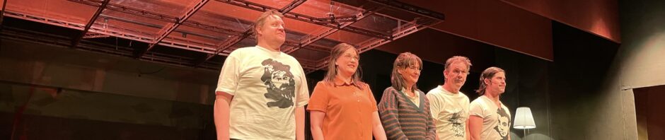 Tuula-Liinan roolissa nähtiin Minna Suuronen, ja näyttelijäntyö sinänsä ok, varmaan ohjaajan ratkaisu oli ollut että hahmo on etäinen olmi, joka ihan lopussa hennosti voimaantuu. Saarikoskea eri elämänvaiheista esittivät Markku Haussila, Santtu Karvonen ja Robin Svanström, jotka kaikki tekivät myös useampia sivurooleja. Ok meininki, mutta ei järisyttävää, eikä Haussilan ryhdikäs tanssijan habitus välttämättä täysin uskottavasti solahtanut pesemättömän, ympäriinsä paneskelevan ja naisissa hoivavietin laukaisevan renttuälykön nahkoihin. Näiden lisäksi lavalla oli Johanna Isokoski useammassa roolissa, mutta ennen kaikkea jumalaisella sopraanollaan laulamassa saksaksi ja ranskaksi klasaribiisejä, joiden sanoista ei tajunnut mitään ja joiden mahdollinen liittyminen tarinaan jäi täysin epäselväksi. Minua ärsytti, seuralainen nautti musiikista. Isokoski laulajana upea, mutta näyttelijänä ei järisyttänyt. Tai sitten oli jälleen ohjaajan valinta se hiippailu ympäri lavaa ja lopun kannustava tekohymy.